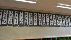 1・2年生は硬筆、3~6年生は毛筆に挑戦し、子どもたちは、朝会時に各学年の作品を見て回りました。