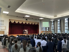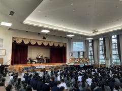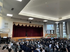2026年1回目の音楽朝会を行いました。今回は音楽委員会の5年生が司会を務めてくれました。 楽器あてクイズでは、似た音がする楽器のどちらが鳴っているのかペア学年で相談しながら考えました。「どっちかな?」「分かった!」と楽しんでいる声が聞こえてきました。 最後には、全学年で「しあわせはこべるように」を歌いました。
