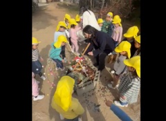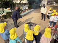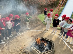 1月15日(木)に園庭で「ミニとんど」を行いました。園庭のお山で学年ごとに、幼稚園に飾っていたしめ縄や餅花、家から持ってきてくれたお正月飾りを燃やして、年神様を空に見送りました。煙を見ながら今年一年病気や怪我をせず元気に過ごせるようにとお願いをしました。