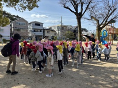 もうすぐ卒園を迎える年長さくら組と一緒に楽しい思い出を作りに、川井公園に散歩へ出かけました。縦割り保育である「なかよし会」で集まる最後の日、みんなでたくさん思い出を作ろうと出発しました。