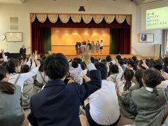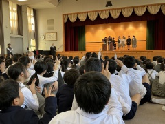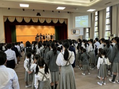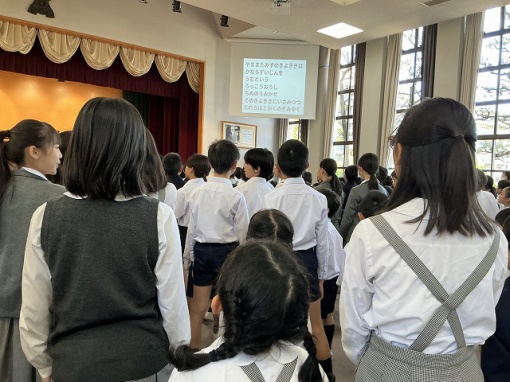 新1年生にとっては初めての全校朝会。2~6年生のお兄さん・お姉さんたちが「ようこそ1年生」を歌い、笑顔と手拍子で温かく迎えてくれました。1年生は、ペアの6年生に手を引かれて講堂へ入場。音楽朝会委員会の進行のもと、自己紹介やリズム遊び、音楽クイズなどが行われ、はじめは緊張した様子も見られましたが、次第に笑顔が増え、楽しみながら参加することができました。