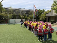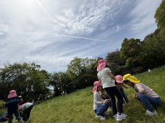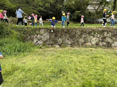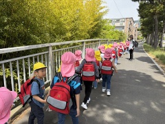 4月18日(金) 爽やかな春の陽気の中、年中たんぽぽ組と年長さくら組の子どもたちが、長きににわたり毎年訪問させていただいている卒業生のお宅へ、園から徒歩約20分の道のりを約束を守って歩いて野遊びに出かけました。