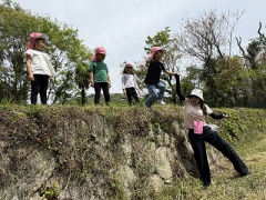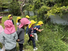 たんぽぽ組は初めての訪問だったため、たくさんの虫に少し驚く姿が見られました。さくら組は、昨年は苦手だったことにも挑戦して成長した姿も見られました。みんなでおにぎりをいただき、戸外で食べる美味しさを味わいながら楽しい時間を過ごし、帰りは疲れも見られつつ無事に帰園すると、「楽しかった」「たくさん歩いた」「いっぱいジャンプした」と語り合ったり発見したことを伝え合ったりして振り返りました。