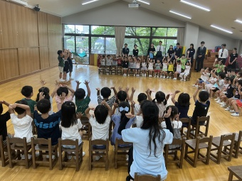 全園児で集う朝の会に始まり、3学年各クラスの活動を見ていただきました。
